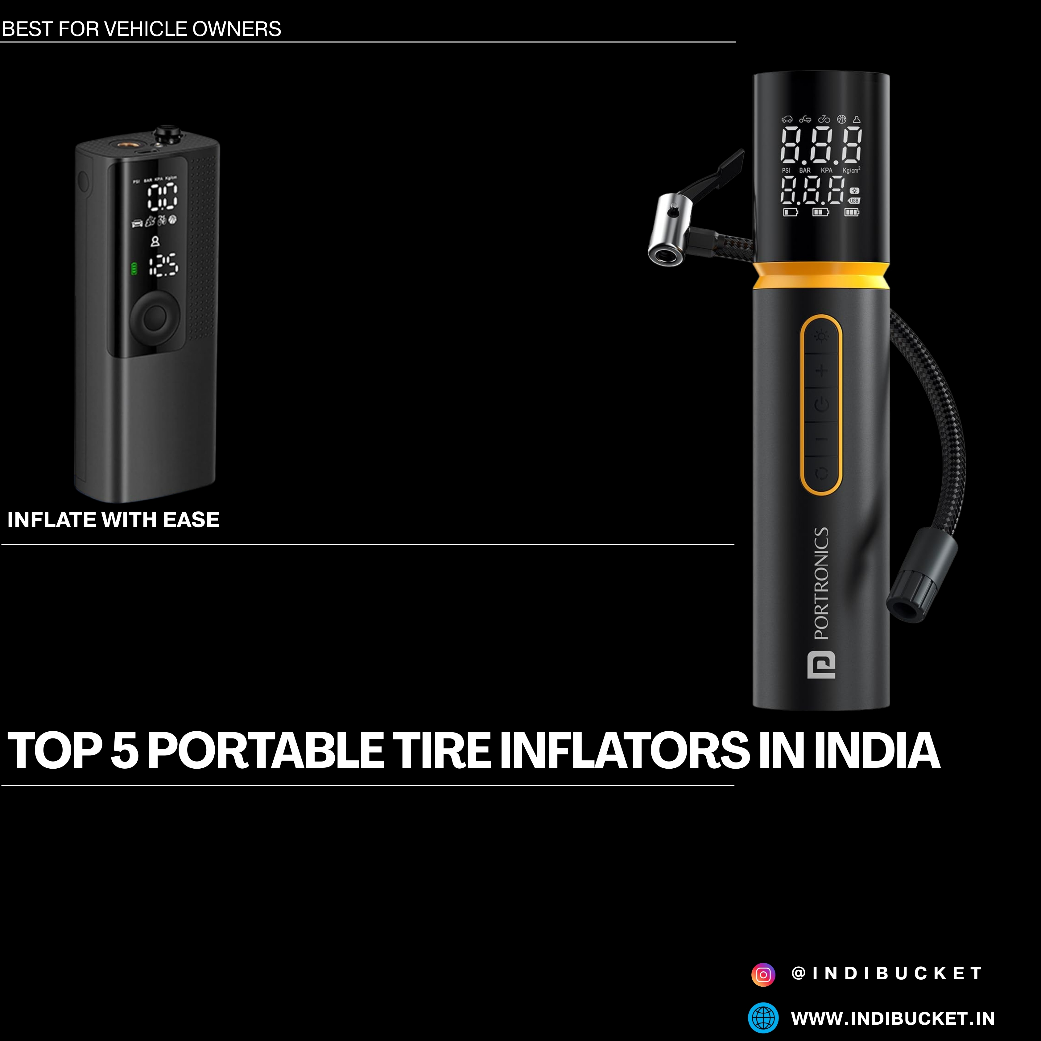 Portronics Vayu 5.0 Rechargeable Tyre Inflator 2. Airmoto Tire Inflator Portable Air Compressor 3. Qubo Smart Tyre Inflator by Hero Group 4. TUSA Cordless Tyre Inflator 5. AGARO Galaxy Cordless...